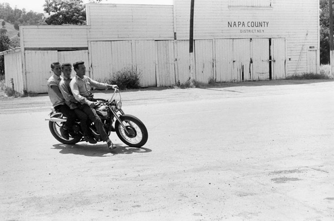 Three young men on a motorcycle, Napa County, District No. 4, Berryessa Valley, 1956