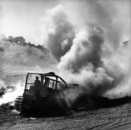 Bulldozer moving burning pile, Berryessa Valley, 1956
